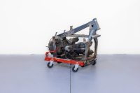 Assembly consisting of the central section of the Moto Guzzi Ercole three‑wheeler frame housing a partially complete engine—missing the intake and exhaust assemblies. For parts use.