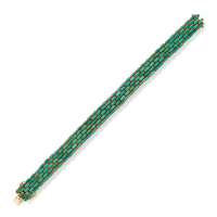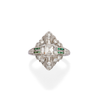 in platinum with old-cut diamonds, baguette-cut diamonds and emeralds. 1920s.