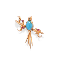 in yellow gold brooch designed as a bird with a blue turquoise body, perched gracefully on a branch.