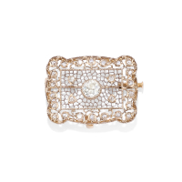 in silver and 9K yellow gold of rectangular shape with a lacework pattern highlighted with rose-cut diamonds and a central Old Mine-cut diamond weighing approx. 0.85 ct. One small diamond deficient.