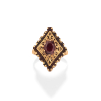 in silver and low-karat yellow gold designed according to the tastes of the period, with rubies of various cuts weighing approx. 1.20 ct all together and Old Mine-cut diamonds weighing approx. 1.00 ct. Late XIX century/early XX century.