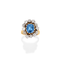 in 9K yellow and white gold set with Old Mine- and Old European-cut diamonds weighing approx. 1.00 ct all together and a central oval, cushion-cut sapphire weighing approx. 3.50 ct. One setting slightly bent.