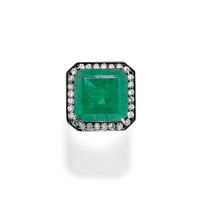 in burnished gold adorned with round brilliant-cut colourless diamonds weighing approx. 1.50 ct and square step-cut emerald weighing approx. 28.00 ct.