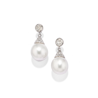 PAIR OF PEARL AND DIAMOND PENDENT EARRINGS