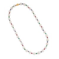 with pearls of varying sizes and shapes interspersed with pink and blue corundum and emerald beads with yellow gold rice-grain clasp.