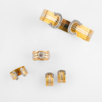 in tricolour gold including a bangle, two rings and a pair of earrings.