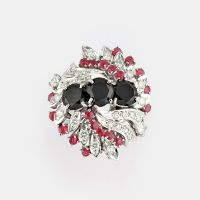 in white gold of scroll design with brilliant-cut diamonds and synthetic black and red stones.