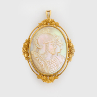 in yellow gold of oval shape with floral elements holding a mother-of-pearl depicting two ancient classical figures.