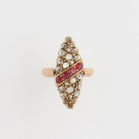 designed as a yellow gold lozenge set with 24 rose-cut diamonds and diagonal row of four rubies.