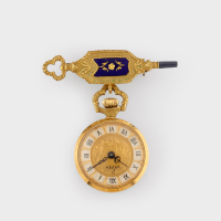 in yellow gold adorned with blue enamel, with round case and decorated dial. Not running at the time of cataloguing.