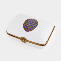 in original porcelain box signed Fabergé Limoges France. The box contains two decks of playing cards depicting the Imperial Fabergé eggs. Limoges, France, circa 1980.