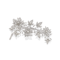 in 14K white gold and diamonds depicting a floral spray. Of elegant design with horizontal orientation. Set with round brilliant-cut diamonds weighing approx. 5.00 ct all together. Clip fittings.