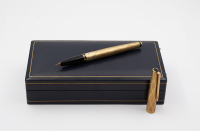 Body in 333% gold, engine turned, pressure knob on the back, hooded nib.