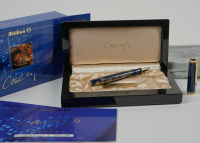 Signed 18K two-tone gold nib, size M, piston filler, mottled blue, yellow and grey.