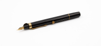 Signed 14K gold nib, N. 3, removable cone, sliding lever with Y-rail, black celluloid and gilt accent.