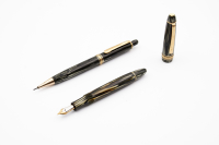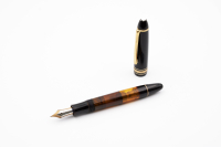Signed two-tone 14K gold nib, size EF, piston filler, black semi-transparent celluloid with gilt accent.