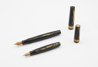 Signed 14K gold nib, F size, purse model with signed 14K gold nib, EF size, lever filling, cap band decorated with Greek key motif, marbled grey celluloid.