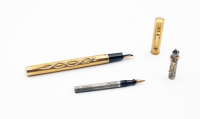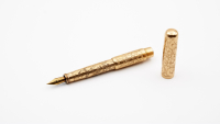 Sliding retractable gold nib, F size, 14K gold body engraved with floral motifs, cap engraved with personalized inscription.