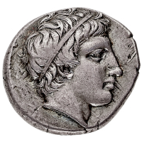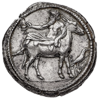 Mende - Tetradramma databile al periodo 460-423 a.C. - Diritto: Dioniso sdraiato sul dorso di un mulo al passo verso destra tiene un kantharos con la mano destra; sulla destra un uccello su una pianta - Rovescio: legenda attorno a un quadrato con all'interno cinque read all