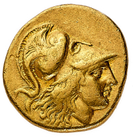 Alessandro III (336-323 a.C.) - Statere databile agli anni 325-324 a.C. - Zecca: Arados - Diritto: testa di Atena con elmo corinzio crestato - Rovescio: la Vittoria stante a sinistra tiene una corona con la mano destra e uno stilo con la sinistra; nel campo a sinistra read all