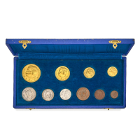 Serie completa dei 10 valori 1912 - Sono presenti gli esemplari in oro da 10 Lire NGC MS 64+ (Cert. #8583649-002), 20 lire, 50 Lire, 100 Lire NGC MS 63 (Cert. #8583649-001), oltre a 1, 2, 5, 20 Centesimi e 1, 2 Lire - Zecca: Roma - Rara serie in cofanetto originale - read all