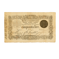Banca Nazionale negli Stati Sardi - Biglietto da 50 Lire - Creazione del 23.1.1867 - Molto raro - Usuali pieghe, fori di spillatura e appunto al rovescio, ma biglietto genuino, migliore di BB