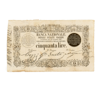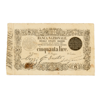Banca Nazionale negli Stati Sardi - Biglietto da 50 Lire - Creazione del 23.1.1867 - Molto raro - Usuali pieghe e fori di spillatura. Alcune macchie della carta, BB