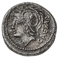 Denario al nome L.IVLI L.F CAESAR databile al 103 a.C. - Zecca: Roma - Diritto: testa elmata di Marte a sinistra - Rovescio: Venere su biga formata da due amorini verso sinistra, tiene uno scettro nella mano destra e le redini con la sinistra - gr. 2,89 - Lievi read all