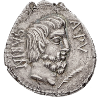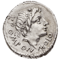 Denario al nome L.POMPON MOLO databile al 97 a.C. - Zecca: Roma - Diritto: testa laureata di Apollo a destra - Rovescio: scena di sacrificio rituale, officiato da Numa Pompilio stante a destra, che accoglie davanti a un'ara accesa la capra vittima del sacrificio, read all