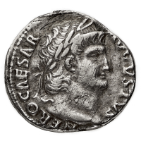 Denario databile al periodo 64-66 d.C. - Zecca: Roma - Diritto: testa laureata dell'Imperatore a destra - Rovescio: Giove seduto a sinistra, tiene un fulmine con la mano destra e un lungo scettro verticale con la sinistra - gr. 3,29 - Patina iridescente, BB