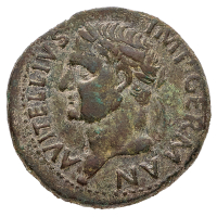 Asse - Zecca: in Spagna, probabilmente Tarraco - Diritto: testa laureata dell'Imperatore a sinistra - Rovescio: Marte in cammino verso sinistra tiene una lancia con la mano destra, un'aquila e uno stendardo con la sinistra - gr. 10,90 - BB - Da un appunto del read all