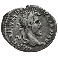 Denario - Zecca: Antiochia - Diritto: testa laureata dell'Imperatore a destra - Rovescio: la Fides stante a sinistra tiene due spighe di grano con la mano sinistra e un cesto di frutta con la destra - gr. 2,52 - Rara - Difetto del metallo al rovescio, BB