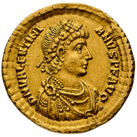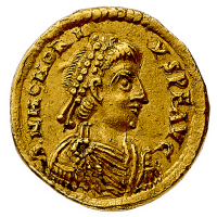 Solido databile al periodo 383-388 d.C. - Zecca: Costantinopoli - Diritto: busto diademato di rosette, paludato e corazzato dell'Imperatore a destra - Rovescio: figura femminile elmata, personificazione di Costantinopoli, seduta in trono di fronte, tiene uno scettro con read all