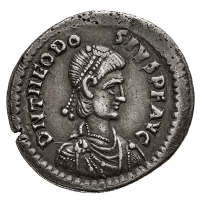 Siliqua databile al periodo 392-395 d.C. - Zecca: Costantinopoli - Diritto: busto diademato di perle, drappeggiato e corazzato dell'Imperatore a destra - Rovescio: legenda entro una corona d'alloro - gr. 1,57 - Migliore di BB