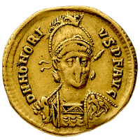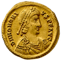 Solido databile al periodo 402-406 d.C. - Zecca: Ravenna - Diritto: busto diademato di perle, drappeggiato e corazzato dell'Imperatore a destra - Rovescio: l'Imperatore stante a destra, tiene uno stendardo con la mano destra e un globo niceforo con la sinistra; con il read all