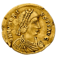Solido databile al periodo 404-408 d.C. - Zecca: Roma - Diritto: busto diademato di perle, drappeggiato e corazzato dell'Imperatore a destra - Rovescio: l'Imperatore stante a destra tiene uno stendardo con la mano destra e un globo niceforo con la sinistra; con il piede read all