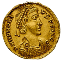 Solido databile al periodo 395-402 d.C. - Zecca: Mediolanum - Diritto: busto diademato di perle, drappeggiato e corazzato dell'Imperatore a destra - Rovescio: l'Imperatore stante a destra tiene uno stendardo con la mano destra e un globo niceforo con la sinistra; con il read all