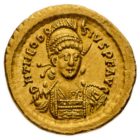 Solido databile al periodo 430-440 d.C. - Zecca: Costantinopoli - Diritto: mezzo busto elmato e diademato dell'Imperatore di fronte, nella mano destra tiene una lancia appoggiata alla spalla - Rovescio: Costantinopoli seduta a sinistra tiene un globo crucigero con la read all