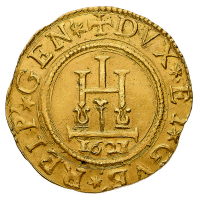 Governo dei Dogi Biennali (1528-1797) - Da 2 Doppie 1621 - Diritto: castello con data sottostante - Rovescio: croce ornata - gr. 13,51 - Rara - Sigle GF - q.SPL