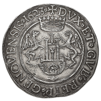Governo dei Dogi Biennali (1528-1797) - Da 2 Scudi 1637 - Diritto: castello con cerchio sormontato da un anello e con due grifoni; sotto una testa alata - Rovescio: croce ornata accantonata da quattro teste alate - gr. 75,85 - Sigle IBSUS - Rara - q.SPL