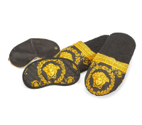 Gianni Versace slippers in black terry and cotton with black-and-gold Barocco print; Gianni Versace sleeping mask in black silk with Barocco print in black and gold; Chanel sleeping mask in black silk with golden trim and CC logo on one side.
