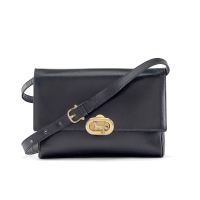 black leather with red leather lining. Leather strap. Flap closure with iconic Horsebit clasp forming the letter G. Golden-tone metal hardware.