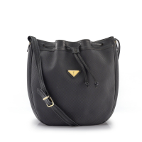 in black plasticized textured fabric. Lining with logo fabric. Adjustable handle and black leather inserts. Leather drawstring closure. Golden-tone metal hardware.