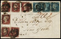Europe and Overseas Destinations 1845 - United States - Letter dated 3 February from London to New York franked with 1 p. red, six examples, + 2 p. blue, horizontal strip of three - Rare - For consideration - Signature of G.Bolaffi (Yv. n.read all