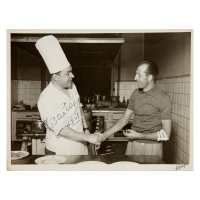 Bartali, Gino. Bella e simpatica foto in bianco e nero (175 x 230 mm, Bertazzini, Torino) con firma autografa e anno “1957” che raffigura il famoso campione di ciclismo, vincitore di tre Giri d’Italia e due Tour de France, intento a stringere la mano di un cuoco read all