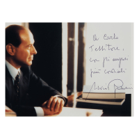 Berlusconi, Silvio. Firma autografa e dedica "con gli auguri più cordiali" su bella fotografia a colori (200 x 250 mm), che ritrae di profilo il Cavaliere, fondatore del gruppo Fininvest e di Forza Italia, per quattro volte Presidente del Consiglio dei ministri della read all