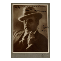 Puccini, Giacomo. Magnifico ritratto fotografico (230 x 170 mm) montato su cartoncino (G. Magrini, Viareggio) del grande compositore con il cappello e l’immancabile sigaro toscano tra le dita con firma e dedica autografa “All’egr. Maestro Mario Parenti in ricordo della read all