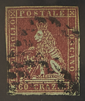 1852 - 60 cr. scarlatto cupo su carta grigia muto di Firenze annullatore - Buona conservazione - Cert. Bottacchi