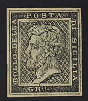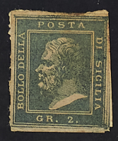 1858 - Saggio Lesoché 2 gr. verde grigio su carta bianca applicato su piccolo frammento di carta - Unico noto - Cert. Sorani