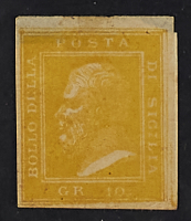 1858 - Saggio Lesaché 10 gr. giallo chiaro su carta bianca applicato su piccolo frammento di carta - Unico noto - Cert. Sorani